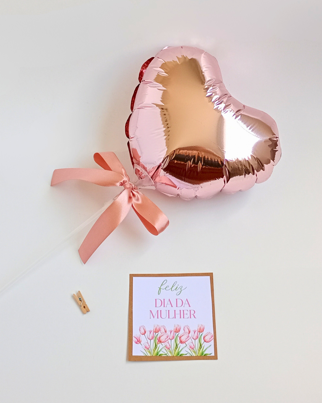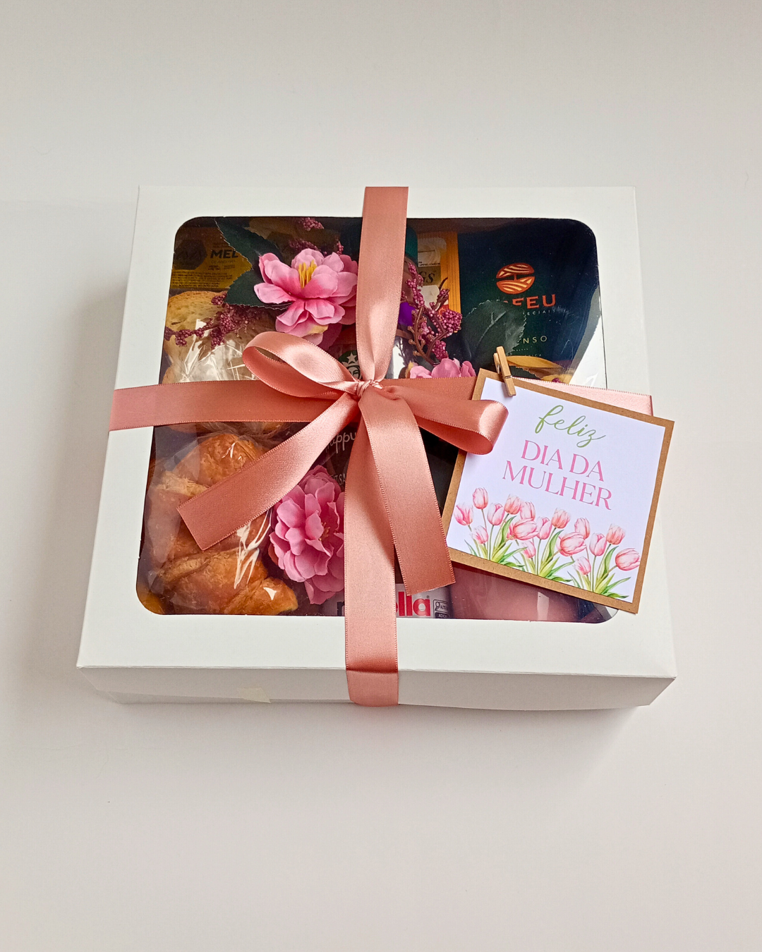 Caixa com visor transparente + Tag Dia das Mulheres e Laço de Cetim + Xícara de porcelana, com pires e colherzinha de madeira + Café Orfeu (drip coffee) + Chocolate Cremoso ou Cappuccino Três Corações + Chá Twinings + Frappuccino Starbucks + Suco de Laranja ou Uva Natural One + Croissant, pães e torradas + Biscoitos amanteigados variados + Nutella 140g + Queijo prato e sachês de manteiga, geleias e mel + Talheres + Decoração com balão e Cartão com a sua mensagem, grátis!