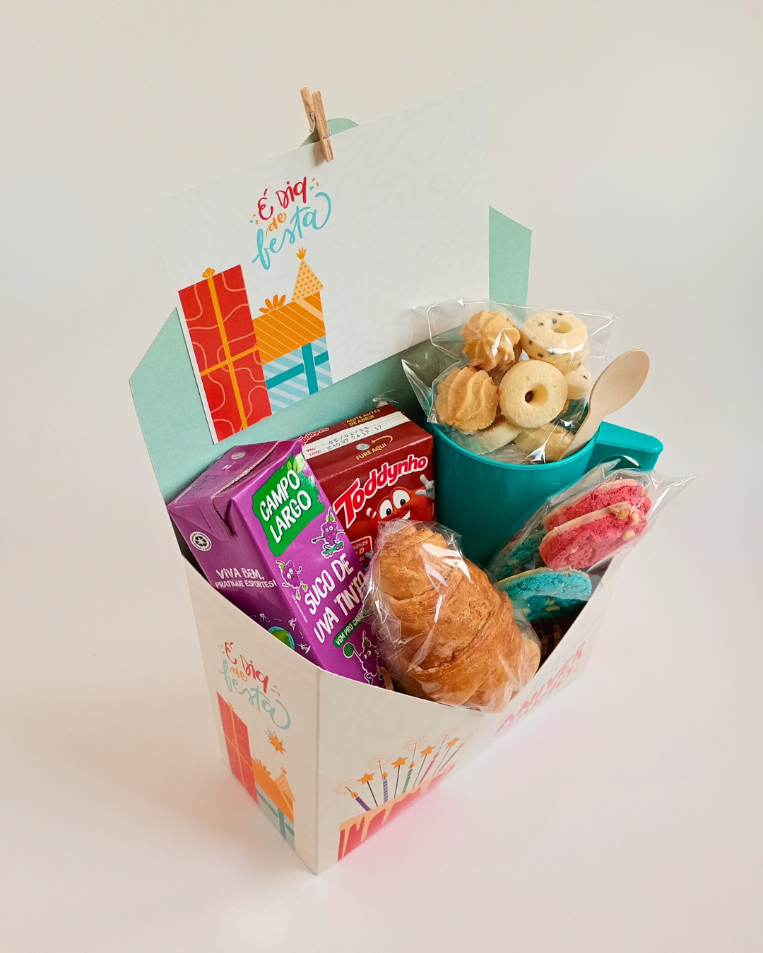 Cesta envelope temática de aniversário + Caneca de plástico cores sortidas + Toddynho tradicional + Suco de uva integral + Croissant + Biscoitos amanteigados + Cookies coloridos sabor Fini + Queijo prato e sachês de manteiga, geleias e mel + Arranjo de Balões + Embalagem de Cesta e Cartão com a sua mensagem, grátis!