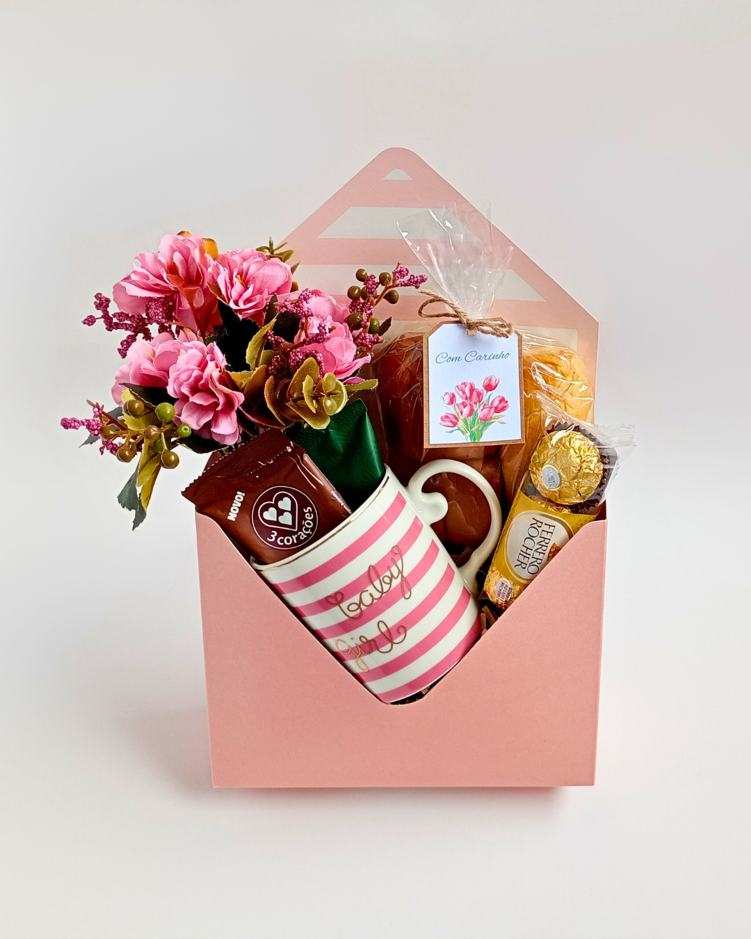 Cesta Envelope na cor rosa claro + Caneca Personalizada "Baby Girl" + Flores Artificiais realistas + Café Orfeu (drip coffee) + Chocolate Cremoso Três Corações + Pães e Torradas + Sachês de mel, manteiga e geleia + Bombons Ferrero Rocher (3 un.) + Embalagem de Cesta e Cartão com a sua mensagem, grátis!