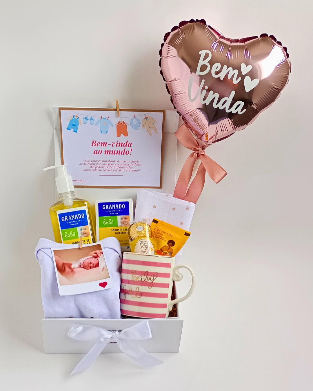 Caixa cartonada na cor branca + Body infantil bebê tamanho G + Cueiro flanelado + Sabonete líquido e sabonete em barra Granado Baby + Caneca Baby Girl + Chá especial para mamães + Bombons Ferrero Rocher (3 un.) + Embalagem de cesta, balão em formato de coração e cartão com a sua mensagem grátis!