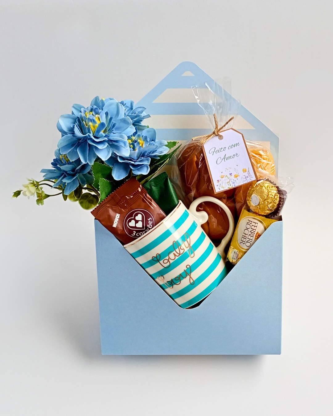 Cesta Envelope na cor rosa claro + Caneca Personalizada "Baby Boy" + Flores Artificiais realistas + Café Orfeu (drip coffee) + Chocolate Cremoso Três Corações + Pães e Torradas + Sachês de mel, manteiga e geleia + Bombons Ferrero Rocher (3 un.) + Embalagem de Cesta e Cartão com a sua mensagem, grátis!
