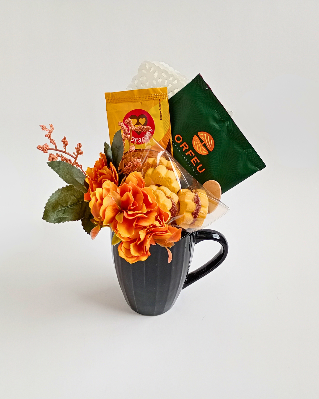 Caneca de porcelana canelada preta + Flores artificiais realistas + Biscoitos amanteigados diversos sabores + Café Orfeu (drip coffee) + Cappuccino ou Chocolate cremoso Três Corações + Sachê de mel, colherzinha e toalha de papel + Embalagem de cesta e Cartão com a sua mensagem, grátis!
