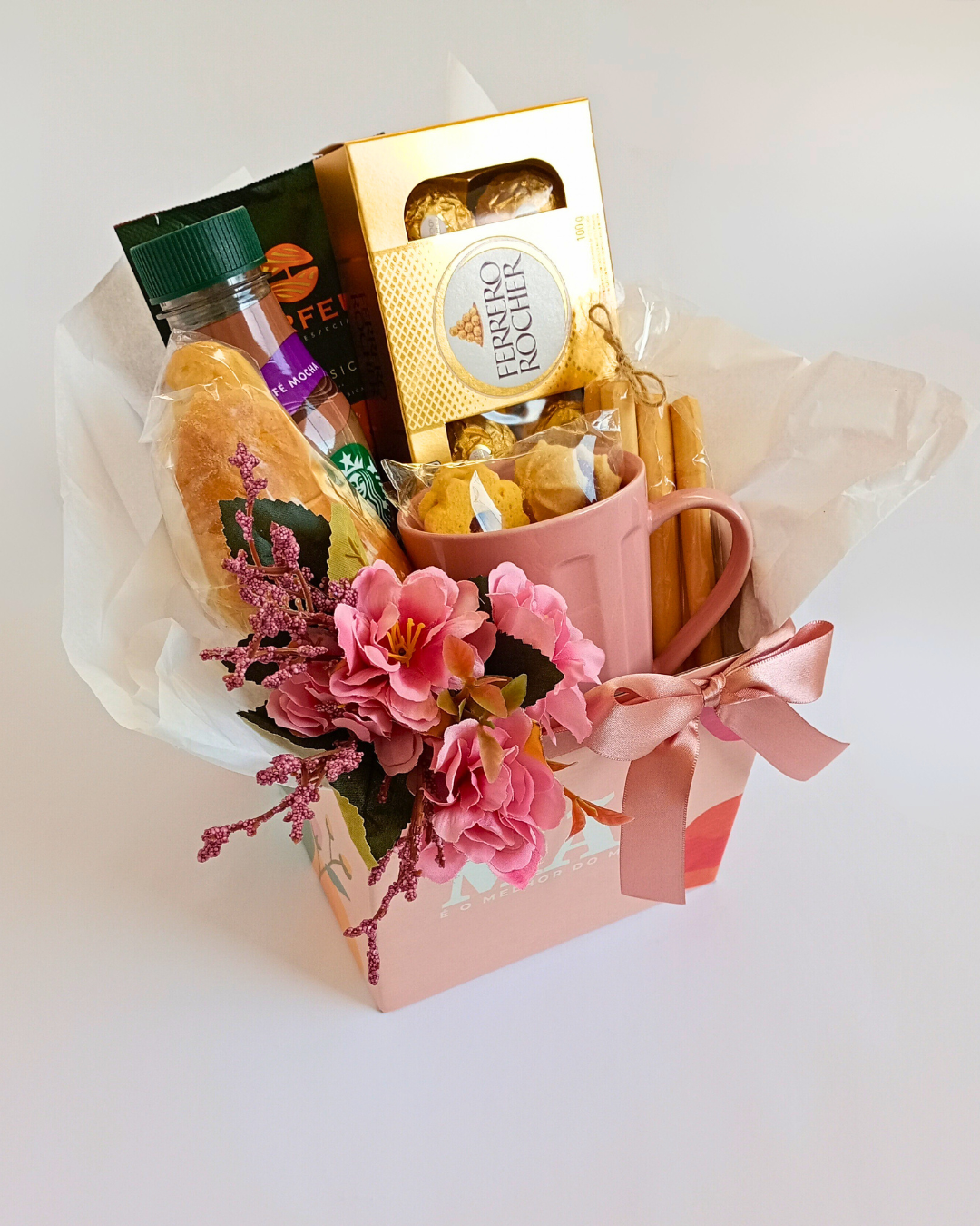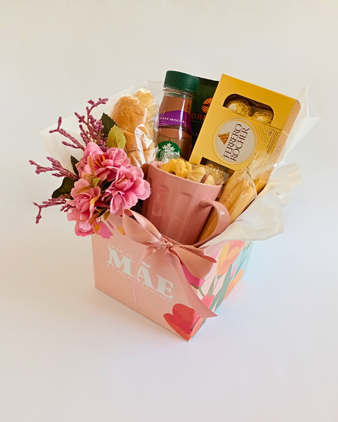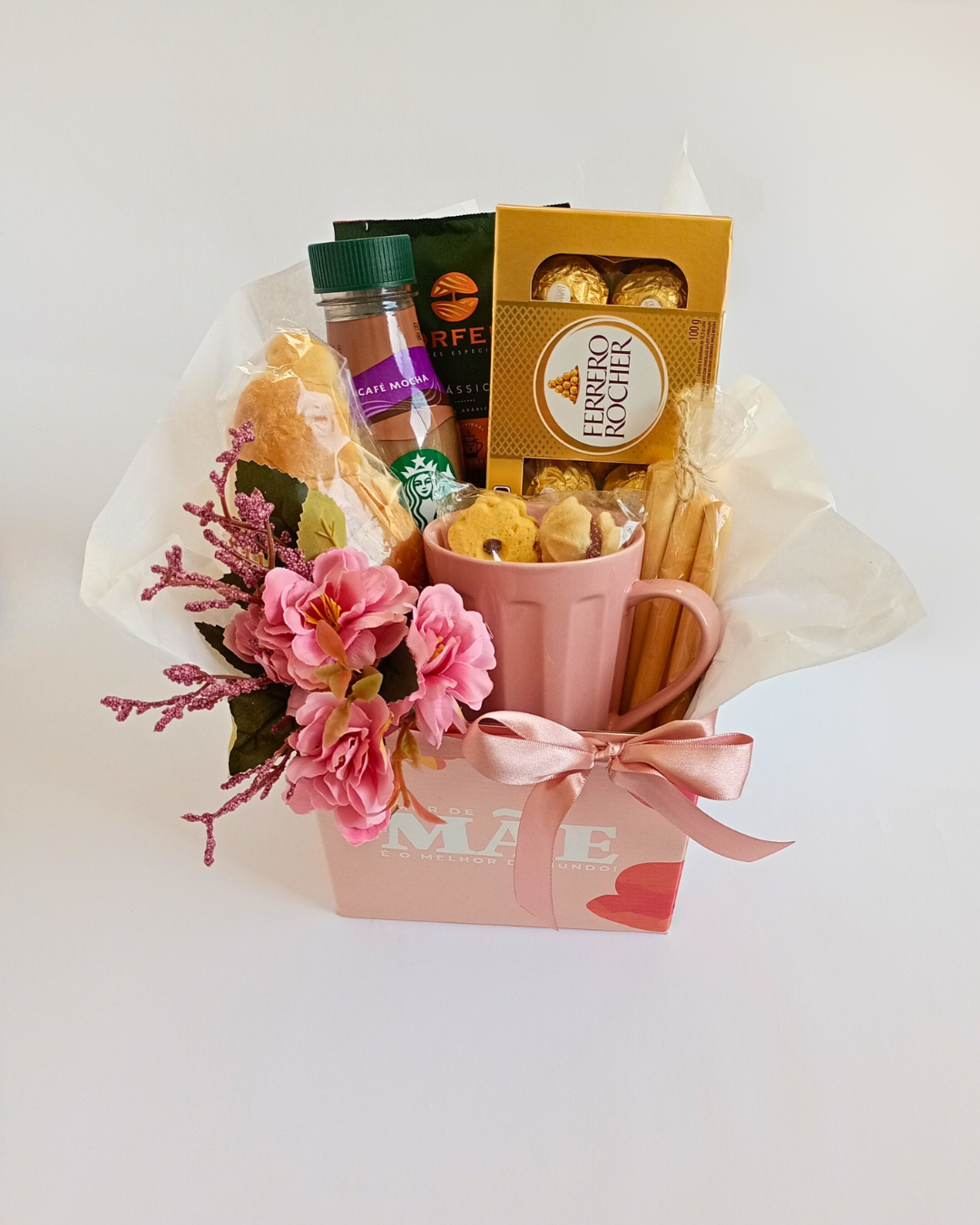 Cesta Cachepô "Amor de Mãe é o Melhor Amor do Mundo" + Caneca de porcelana rosa + Café Orfeu (drip coffee) + Frappuccino Starbucks + Bombons Ferrero Rocher (8 un.) + Flores artificiais realistas + Croissant, Grissinis e Torradas + Biscoitos amanteigados diversos sabores + Embalagem de Cesta e Cartão com a sua mensagem, grátis!